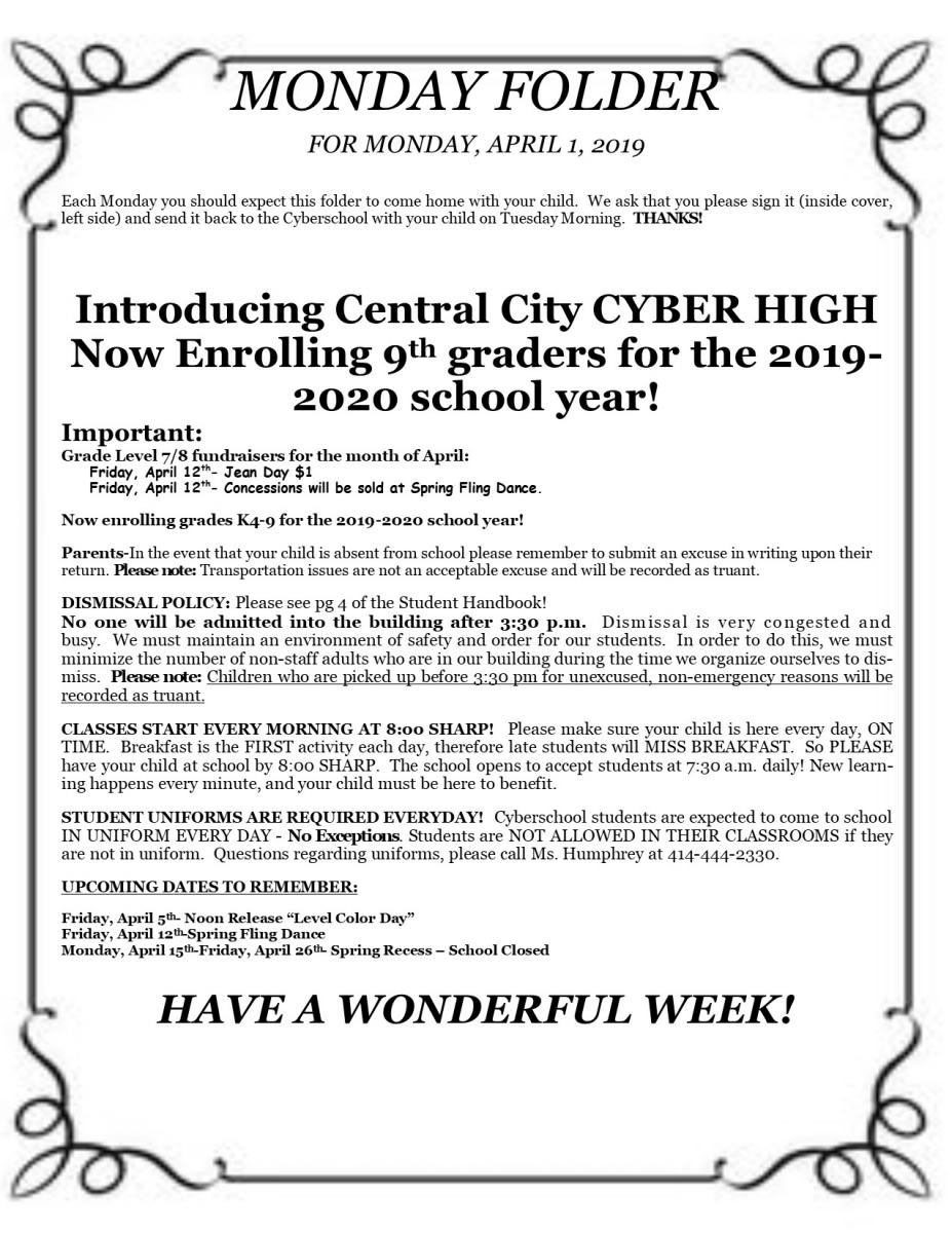 Click here to read the Monday Folder information for the week of 4/1/2019